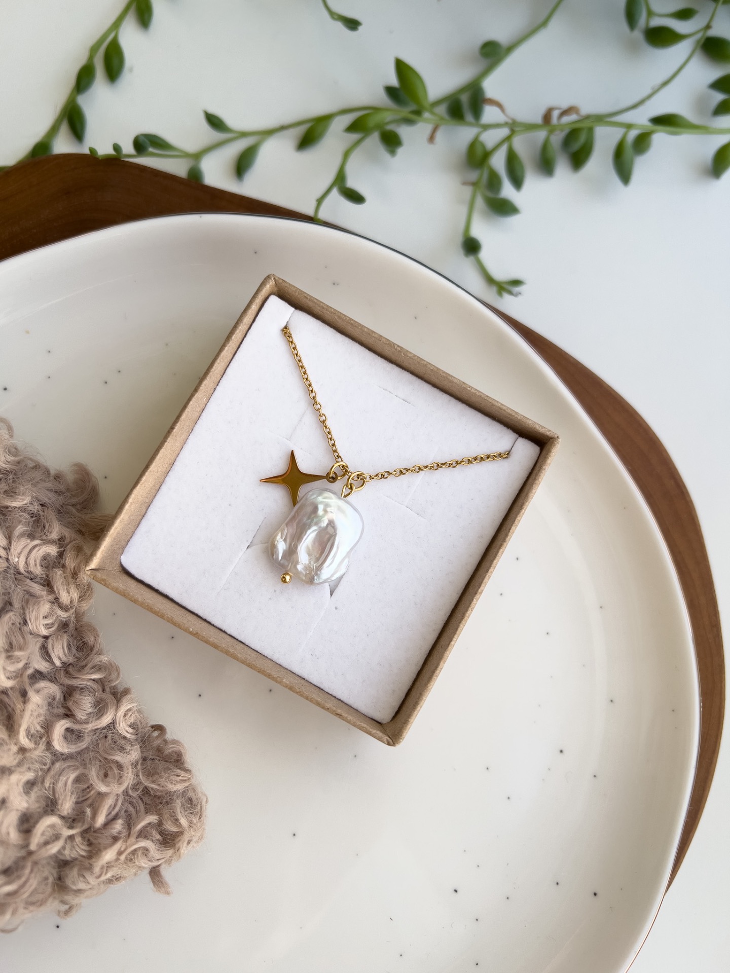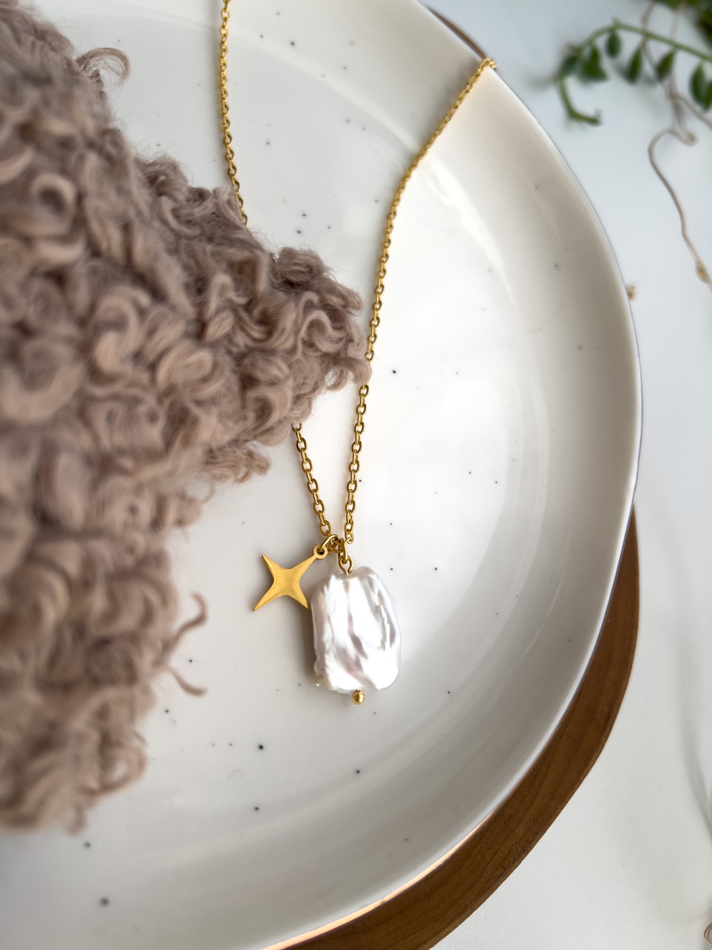 Polárka – jemná, sebejistá a vždycky na svém místě. Na ocelovém řetízku se houpe velká plochá barokní perla, každá s jedinečným tvarem, a vedle ní drobná hvězda, která celému náhrdelníku dodává jiskru a symboliku. Je to krásná kombinace elegance a nenápadné síly – jako kdybych na jednom šperku spojila ženskost a jedinečnost. Perla působí nadčasově, hvězda zase připomíná, že každá z nás má vlastní cestu a vlastní světlo. Náhrdelník nosí lehce a snadno ho zkombinuješ s čímkoli – od jednoduchého trička až po večerní outfit. Proč si zamiluješ právě náhrdelník Polárka Každá barokní perla je originál – žádné dva náhrdelníky nejsou stejné. Kombinace perly a hvězdy symbolizuje ženskou energii, směr a vnitřní sílu. Nadčasový styl, který zapadne do každodenního i elegantního outfitu. Ocelový řetízek je odolný, nečerná a vydrží krásný dlouhá léta. Skvělý dárek pro ženu, která si zaslouží připomenout, že má vlastní světlo Materiál a balení Materiál: přírodní barokní perla, ocel, kovový přívěsek ve tvaru hvězdy Délka řetízku: 45 cm + prodlužovací řetízek (Jestli potřebuješ jinou délku, uveď požadavek do poznámky v závěru objednávky :-)) Zapínání: ocel Balení: dárková krabička v ceně ✨PS: Pokud už řešíš vánoční dárky, tohle je jeden z těch, které zaručeně udělají radost.