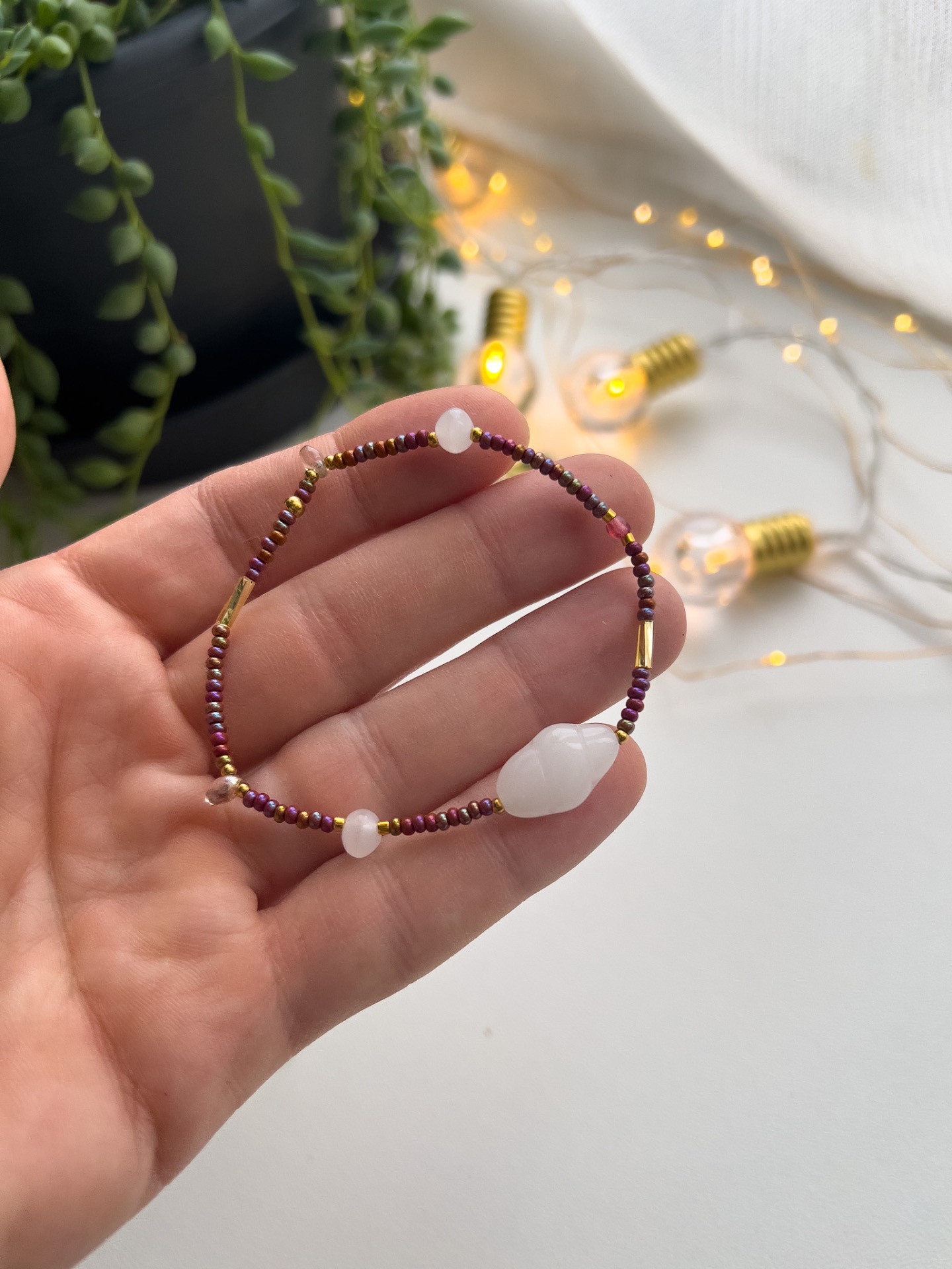 Elegantní náramek tvořený temně červenými skleněnými korálky s duhovými odlesky, doplněný o zlaté kroucené trubičky a dva větší skleněné korálky.