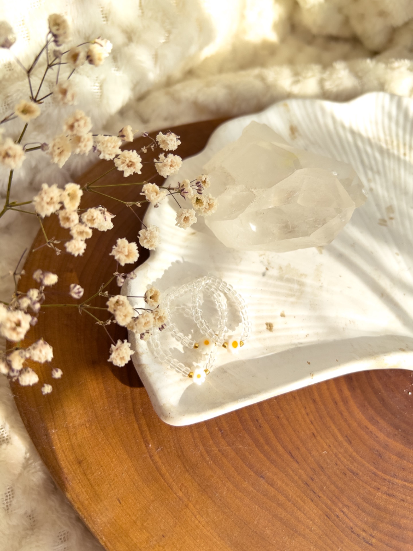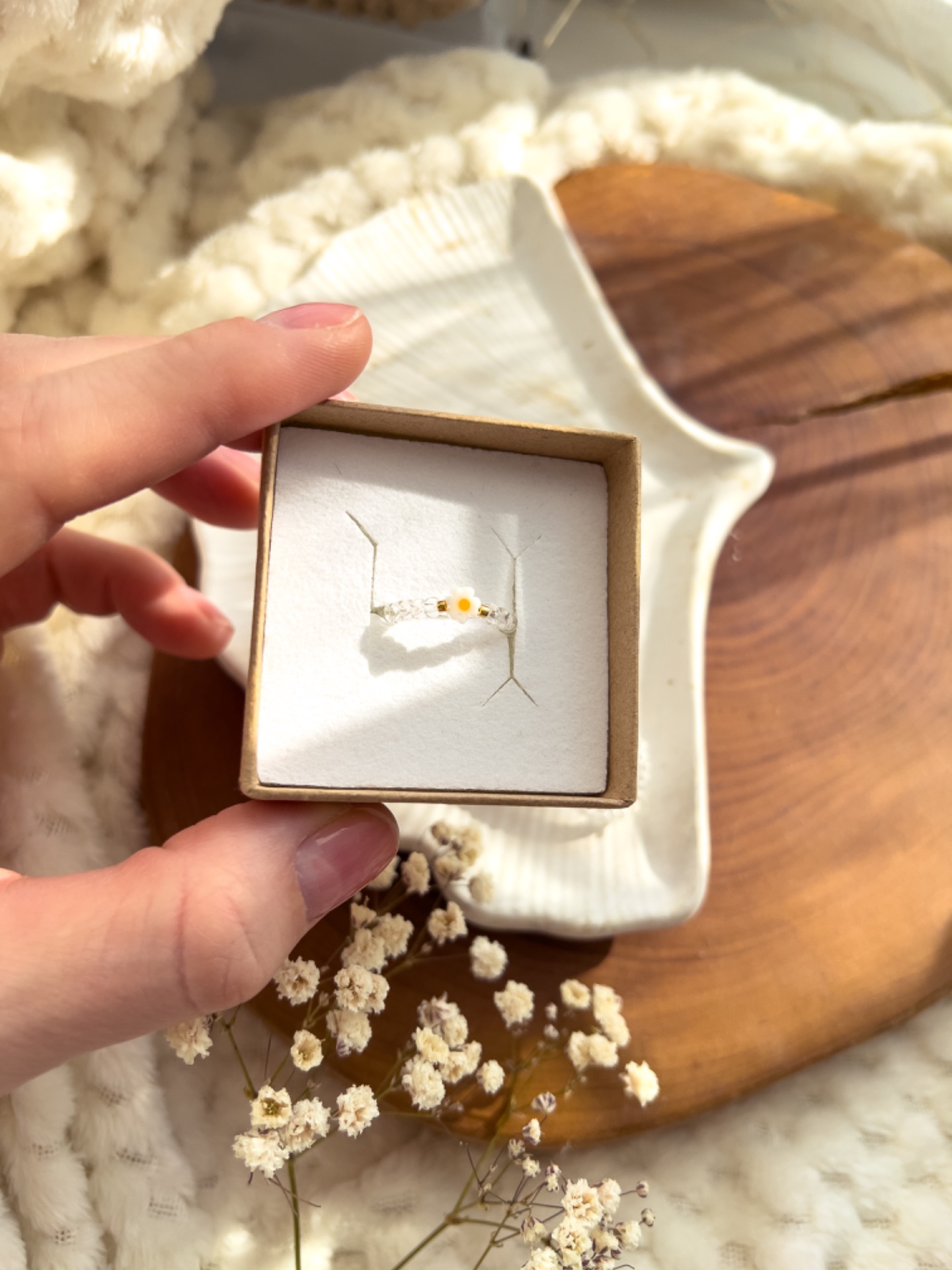 Něžný korálkový prstýnek, tvořený průhlednými, zlatými skleněnými korálky a korálkem ve tvaru sedmikrásky.