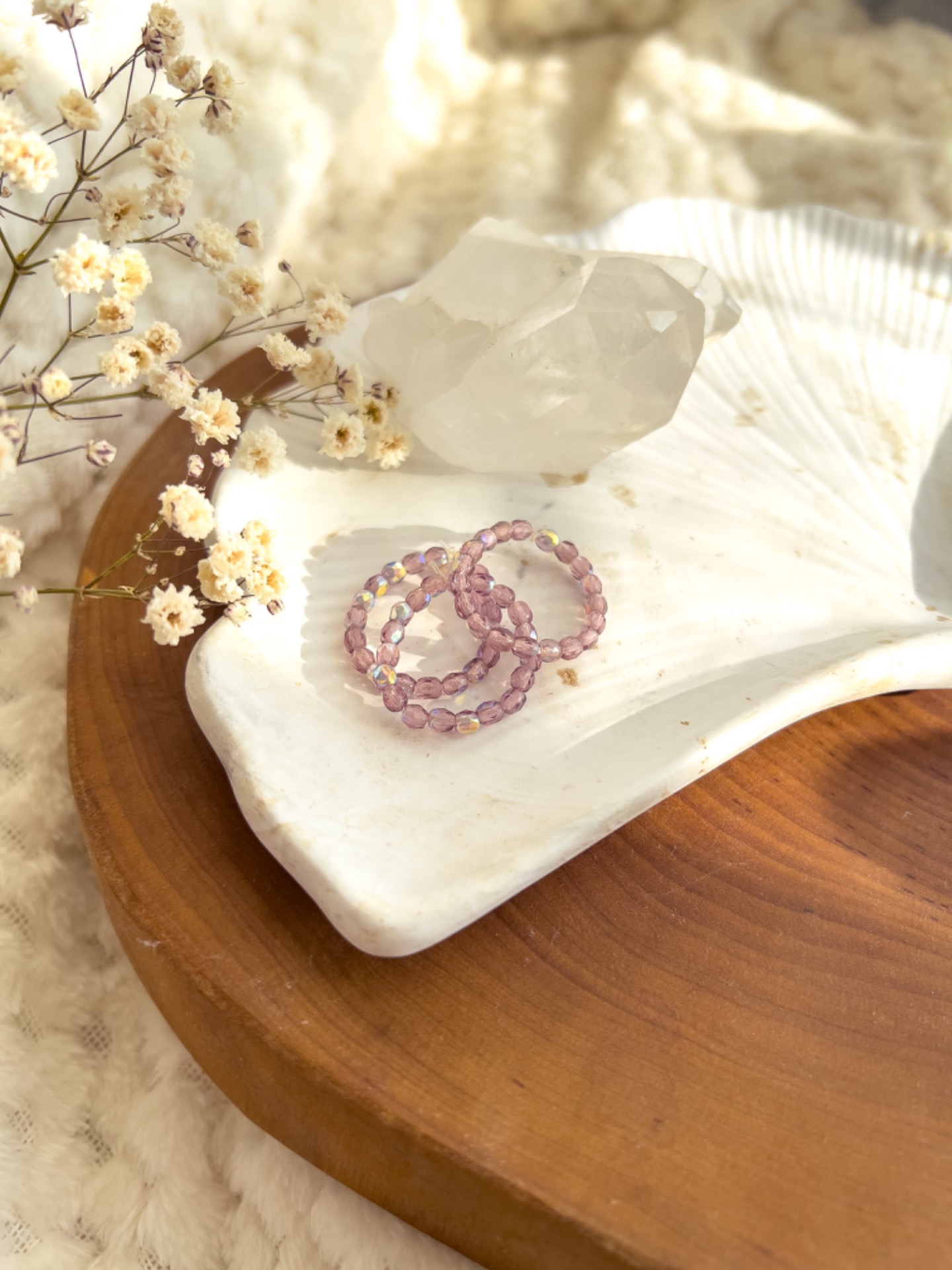 Jemný prstýnek, tvořený broušenými skleněnými korálky.