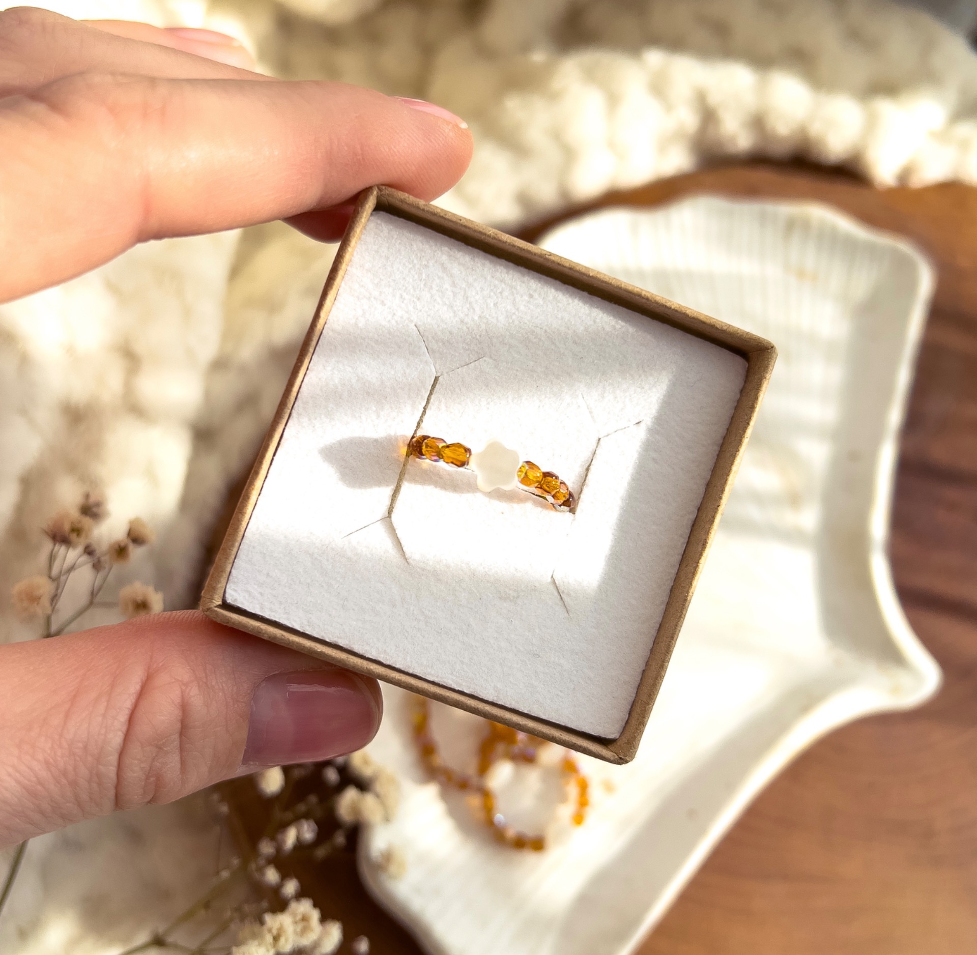 Jemný prstýnek, tvořený broušenými skleněnými korálky v barvě jantaru, doplněný o kytičku z perleti.